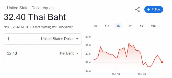 I checked, and 1 US dollar is approximately 35 Thai baht, which is about 1:35.